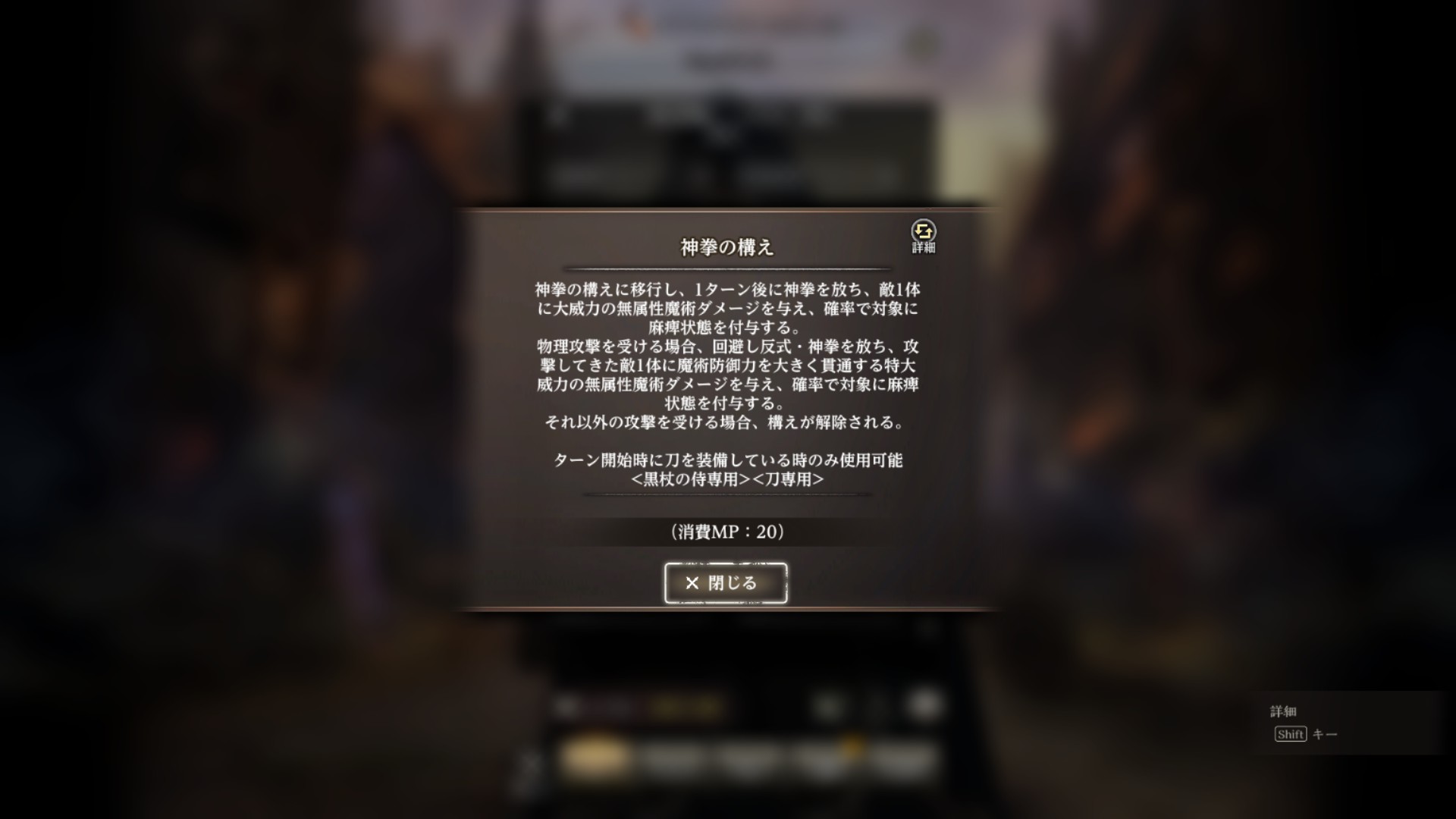 神拳の構えに移行し、1ターン後に神拳を放ち、敵1体に大威力の無属性魔術ダメージを与え、確率で対象に麻痺状態を付与する。